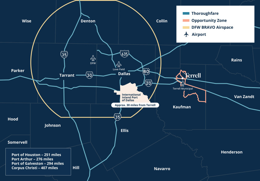 Terrell also lies just outside the DFW BRAVO Airspace, allowing greater flexibility for municipal airport operations and corporate aviation. The Terrell Municipal Airport is a convenient alternative for private and business travel, helping streamline your operations.